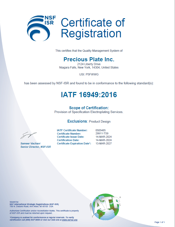 At Precious Plate, our certifications are more than just credentials—they represent our unwavering commitment to quality, traceability, and environmental responsibility. Certified to the stringent IATF 16949:2016 automotive quality management standard and the globally recognized ISO 14001:2015 environmental management standard, we provide electroplating services that meet the highest industry requirements. These certifications ensure you receive consistent, fully documented plating solutions that not only meet your specifications but also support your sustainability goals.